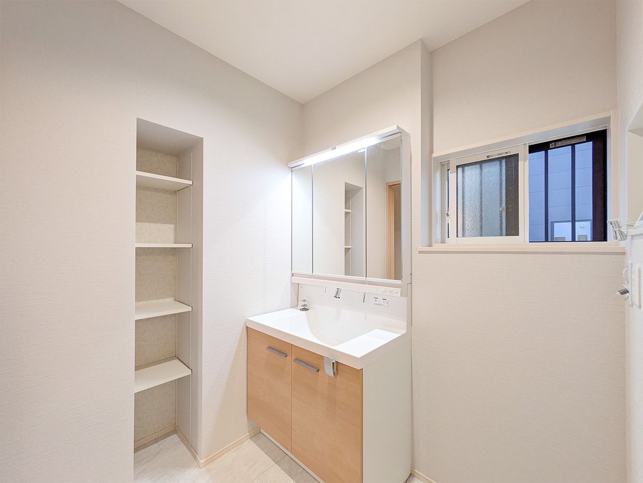 900mm幅の洗面化粧台なので広く使え、毎日の作業もグンと楽になります。ゆとりの収納力でサニタリールームをすっきりと演出します。ミラーの後ろにたっぷり収納できます。つなぎ目のない一体成形カウンターで、お手入れ簡単。