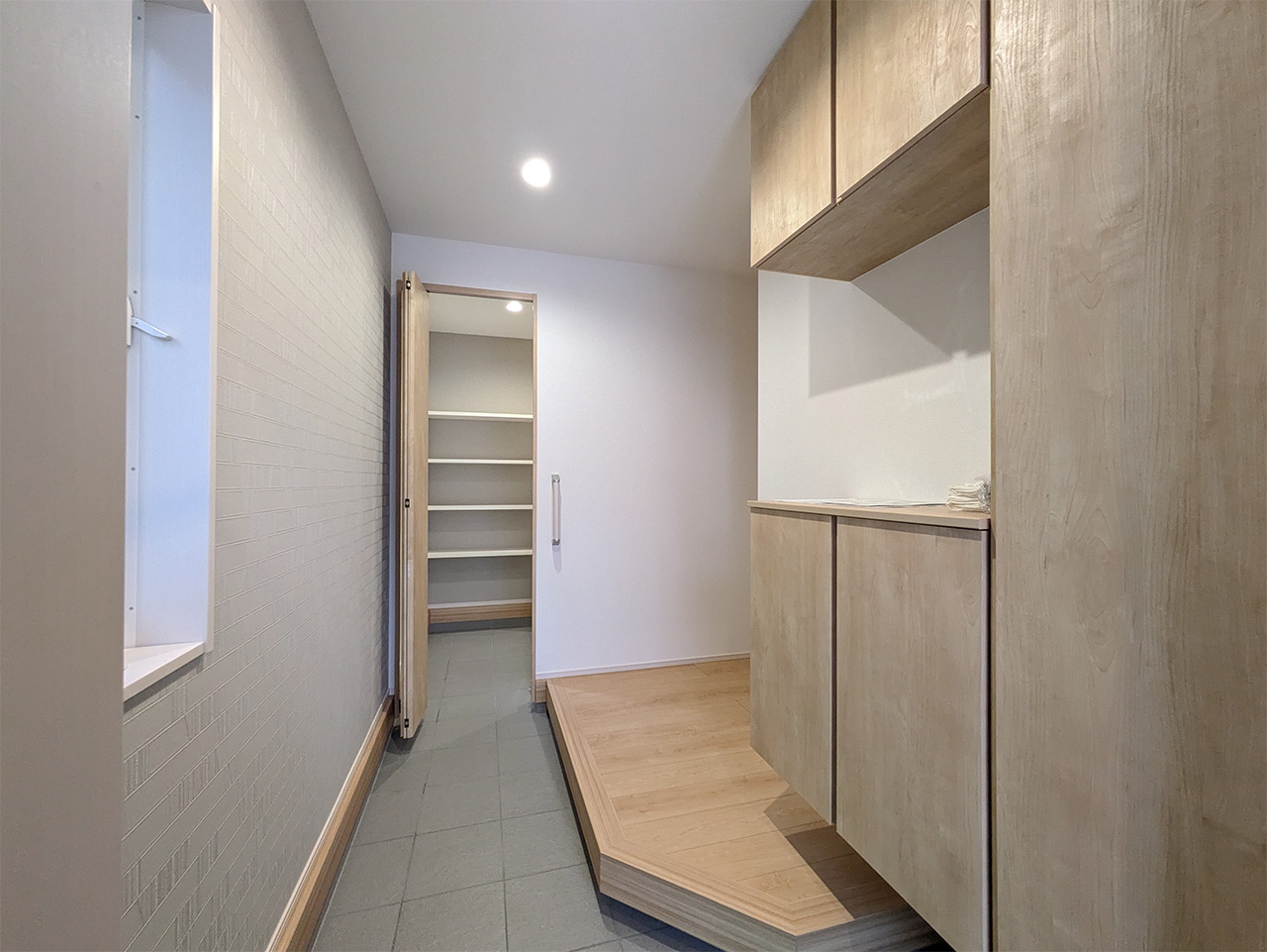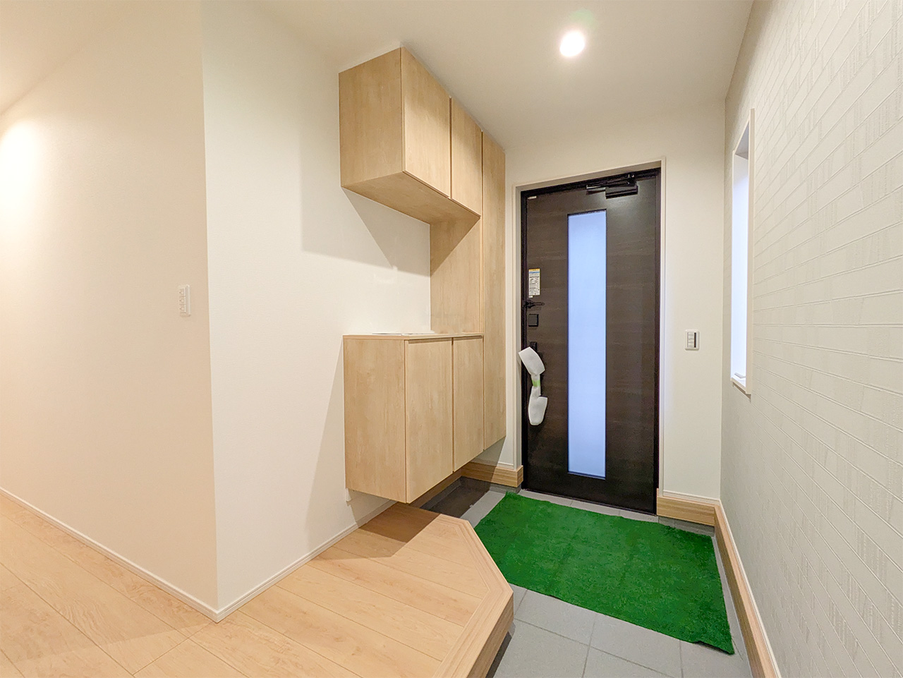 広々とした空間と明るい採光性を確保した玄関エントランス。暗くて狭い玄関スペースのイメージを一新しました。広さを活かして、ベビーカーや自転車・家族で楽しむアウトドア用品などを土間部分に置くこともできます。
