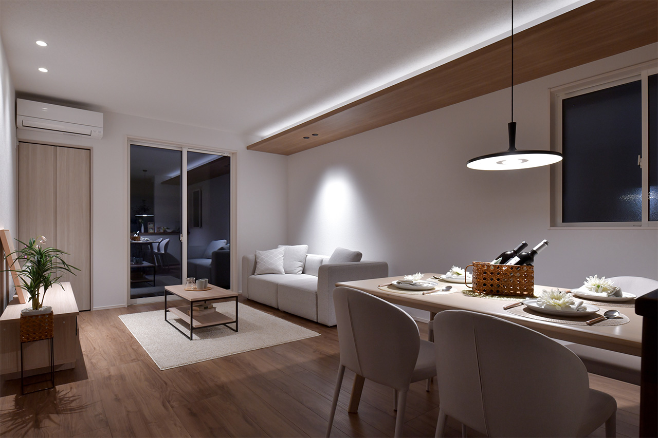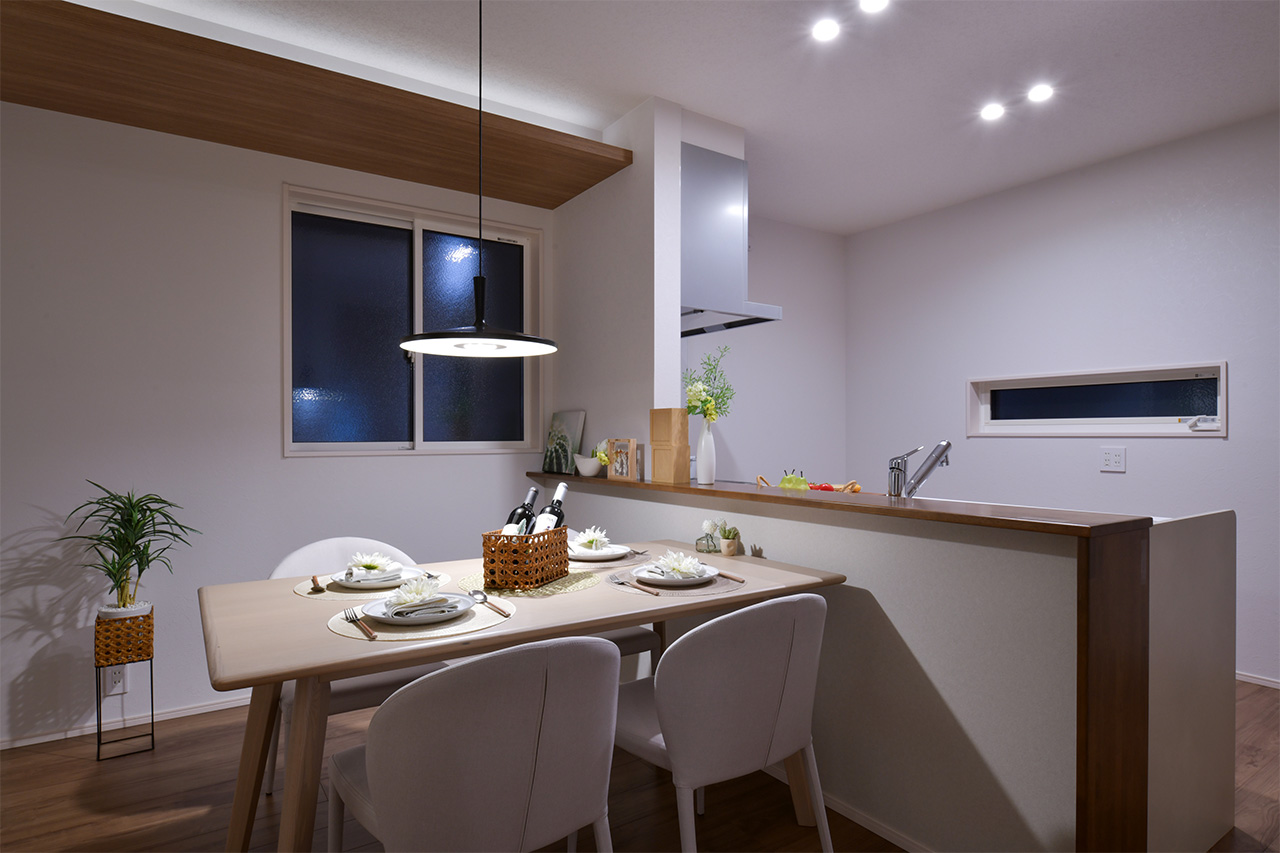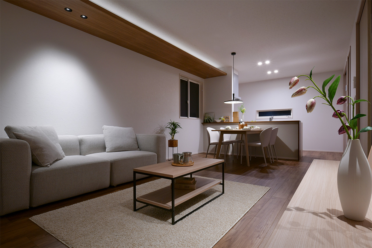 リビングやキッチンの天井に設えた間接照明。やわらかで幻想的な光の演出が、空間を落ち着いた雰囲気に包んでくれます。ご家族の特別な日のサプライズや照明を活かしたインテリアコーディネートなど暮らしに楽しさをプラス。居心地を高め、深める空間プランニングです。