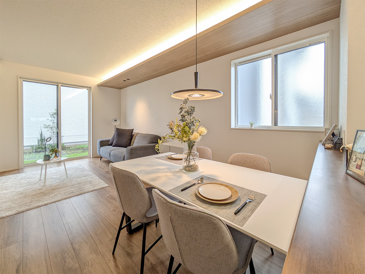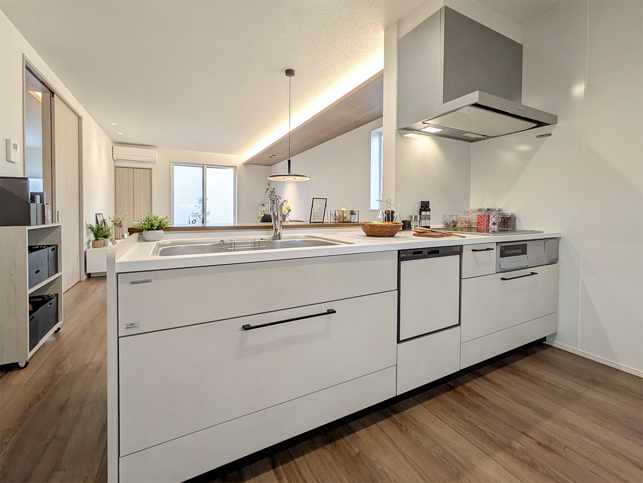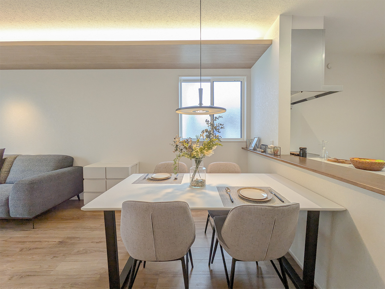 リビングやキッチンの天井に設えた間接照明。やわらかで幻想的な光の演出が、空間を落ち着いた雰囲気に包んでくれます。ご家族の特別な日のサプライズや照明を活かしたインテリアコーディネートなど暮らしに楽しさをプラス。居心地を高め、深める空間プランニングです。