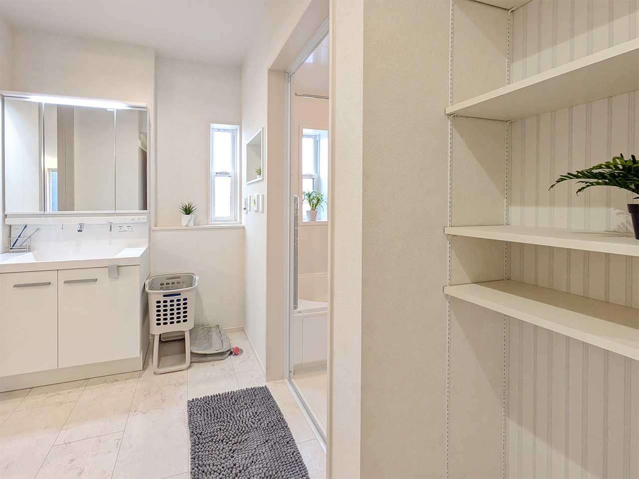 キッチンから洗面室・浴室までを最短距離で結んだ水回り動線設計。家事の移動距離を短縮するとともに、動線上には収納スペースなどをレイアウトし機能性も高めました。スマートな動線設計と時短設備が子育てにがんばるご家族をサポートします。