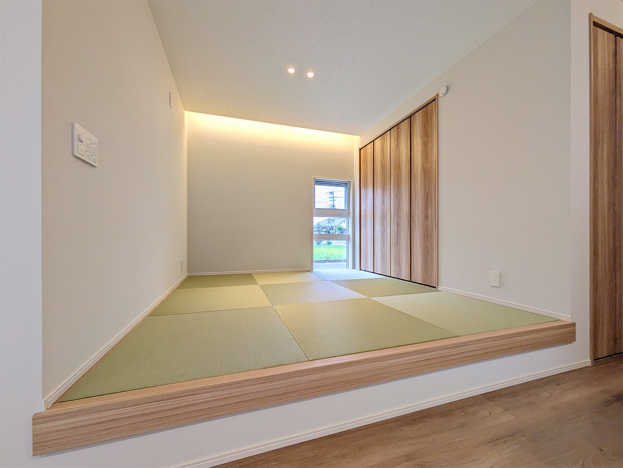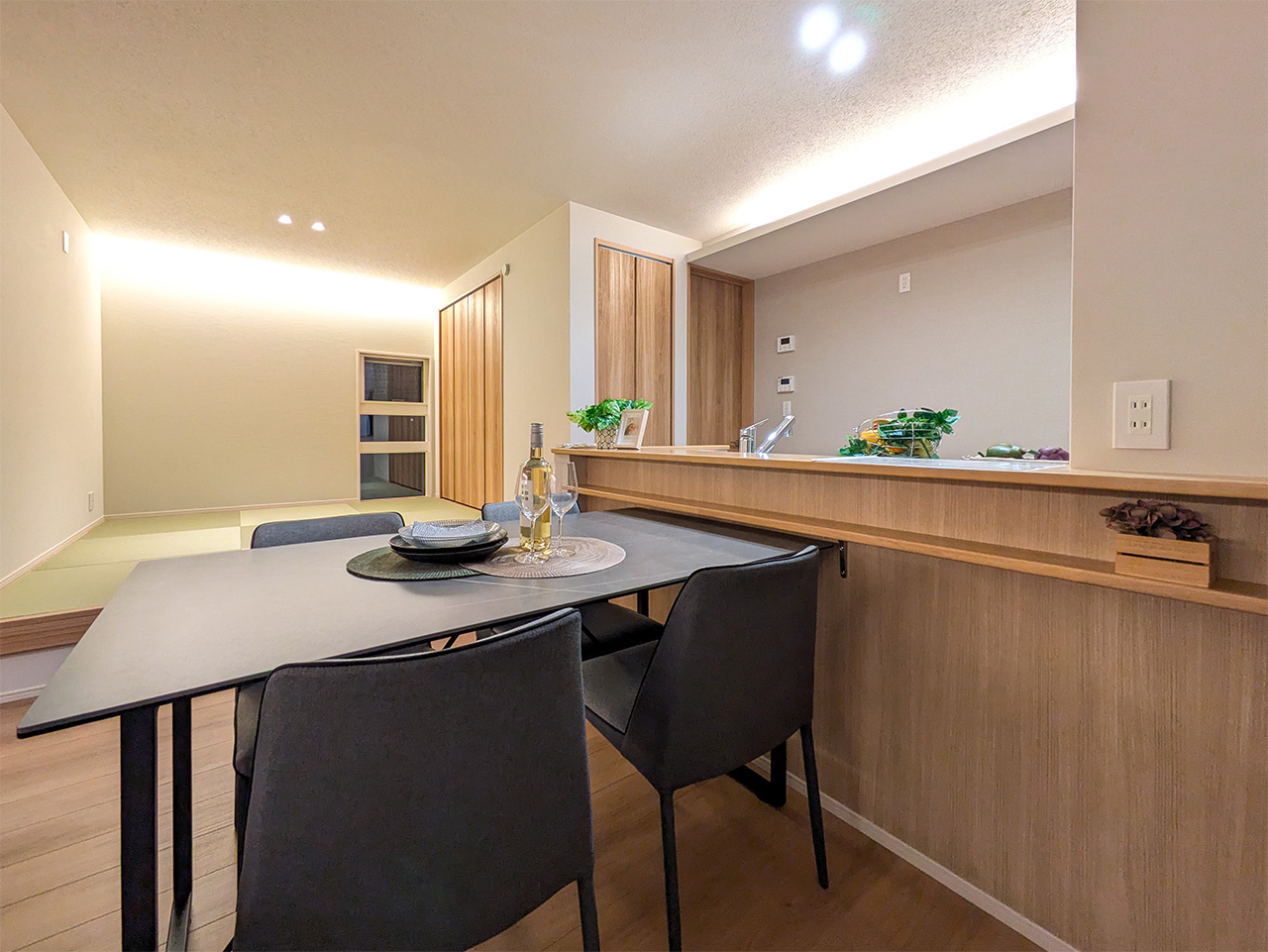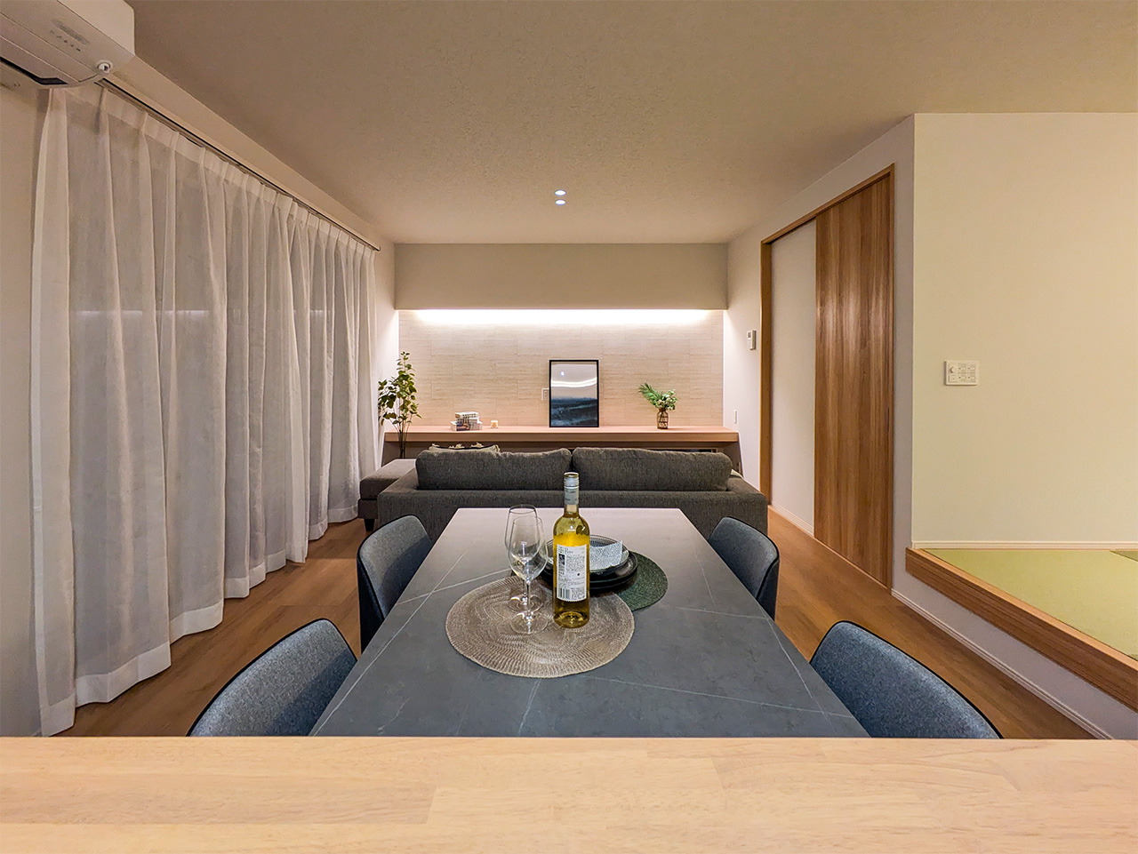LDKと緩やかに繋がるタタミコーナー。柔らかい畳の上でお昼寝したり、子どもと寝そべって本を読み聞かせしたり、時にはお座敷スタイルで一味違うディナーを楽しんだり。ちょっと贅沢な時間を楽しめる個性的な和モダン空間です。