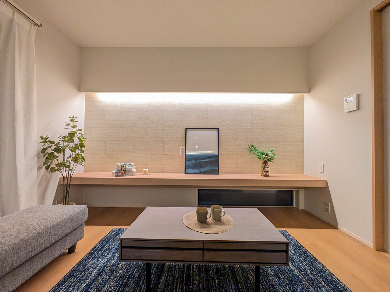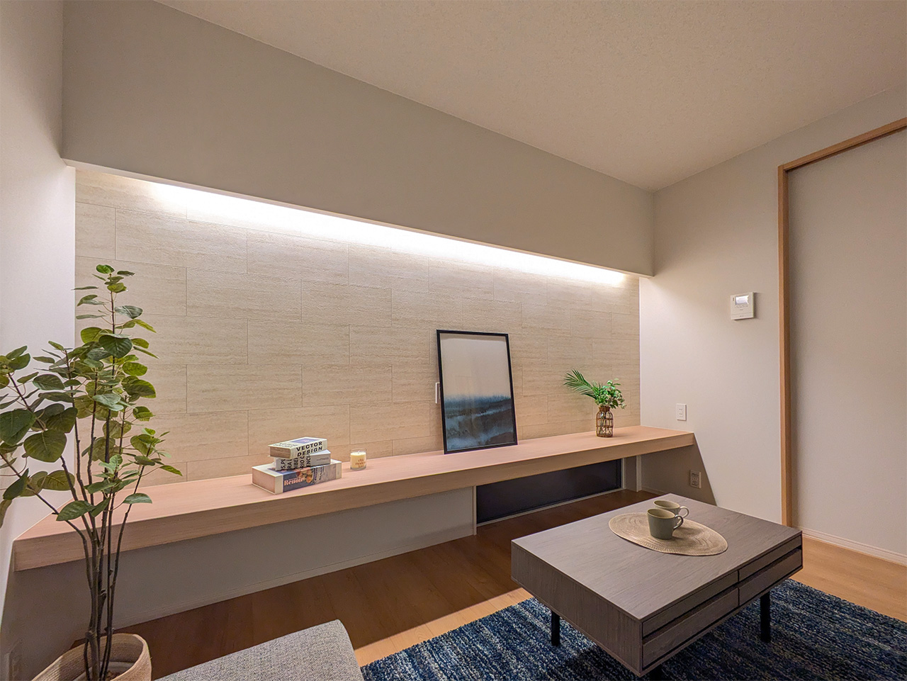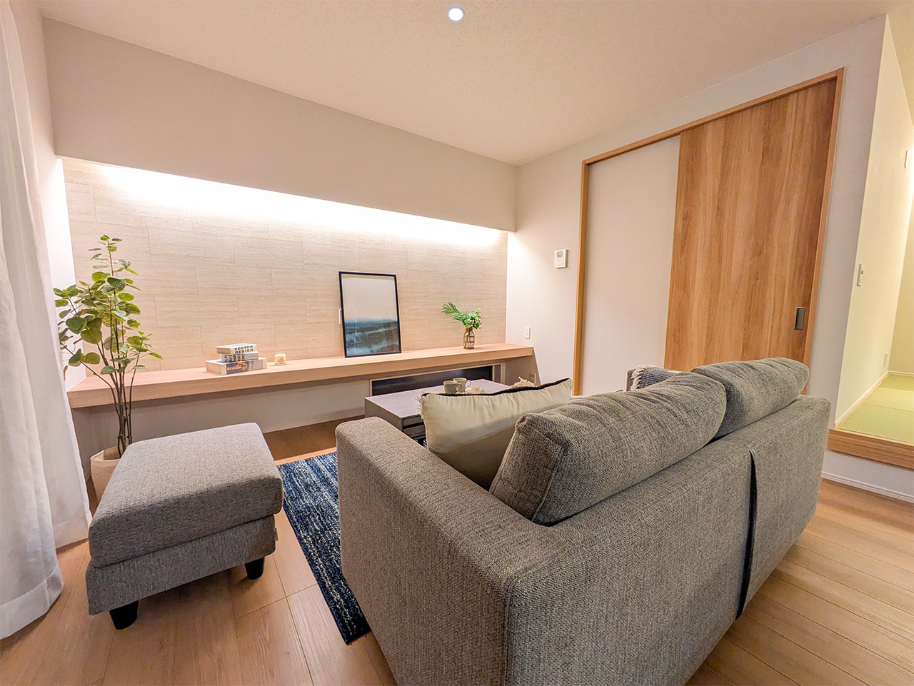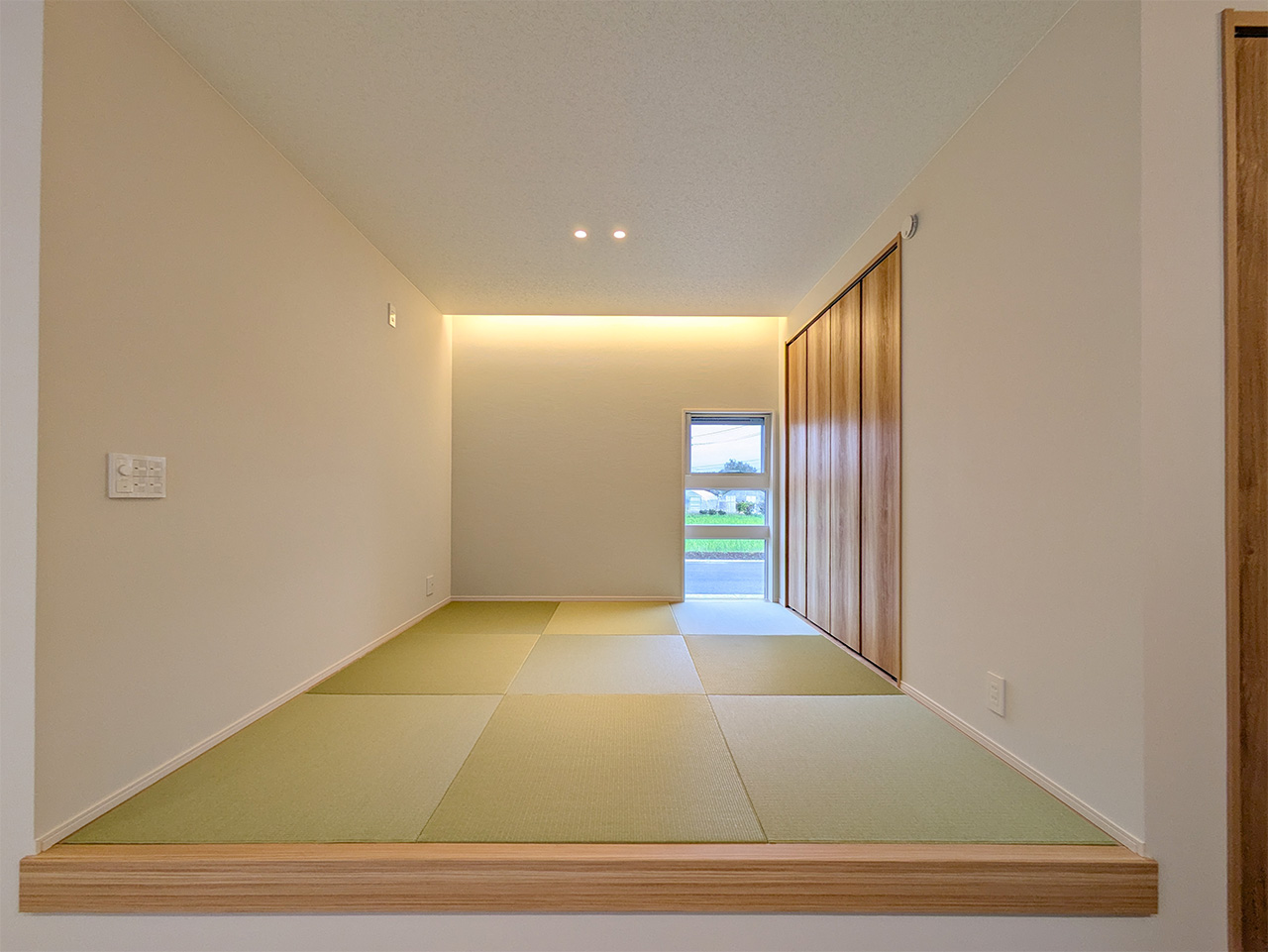 LDKと緩やかに繋がるタタミコーナー。柔らかい畳の上でお昼寝したり、子どもと寝そべって本を読み聞かせしたり、時にはお座敷スタイルで一味違うディナーを楽しんだり。ちょっと贅沢な時間を楽しめる個性的な和モダン空間です。