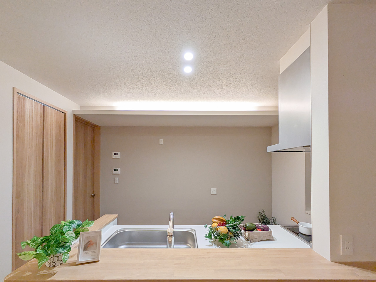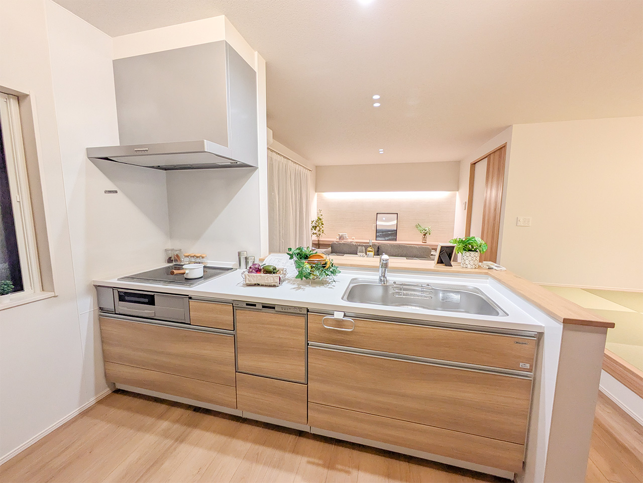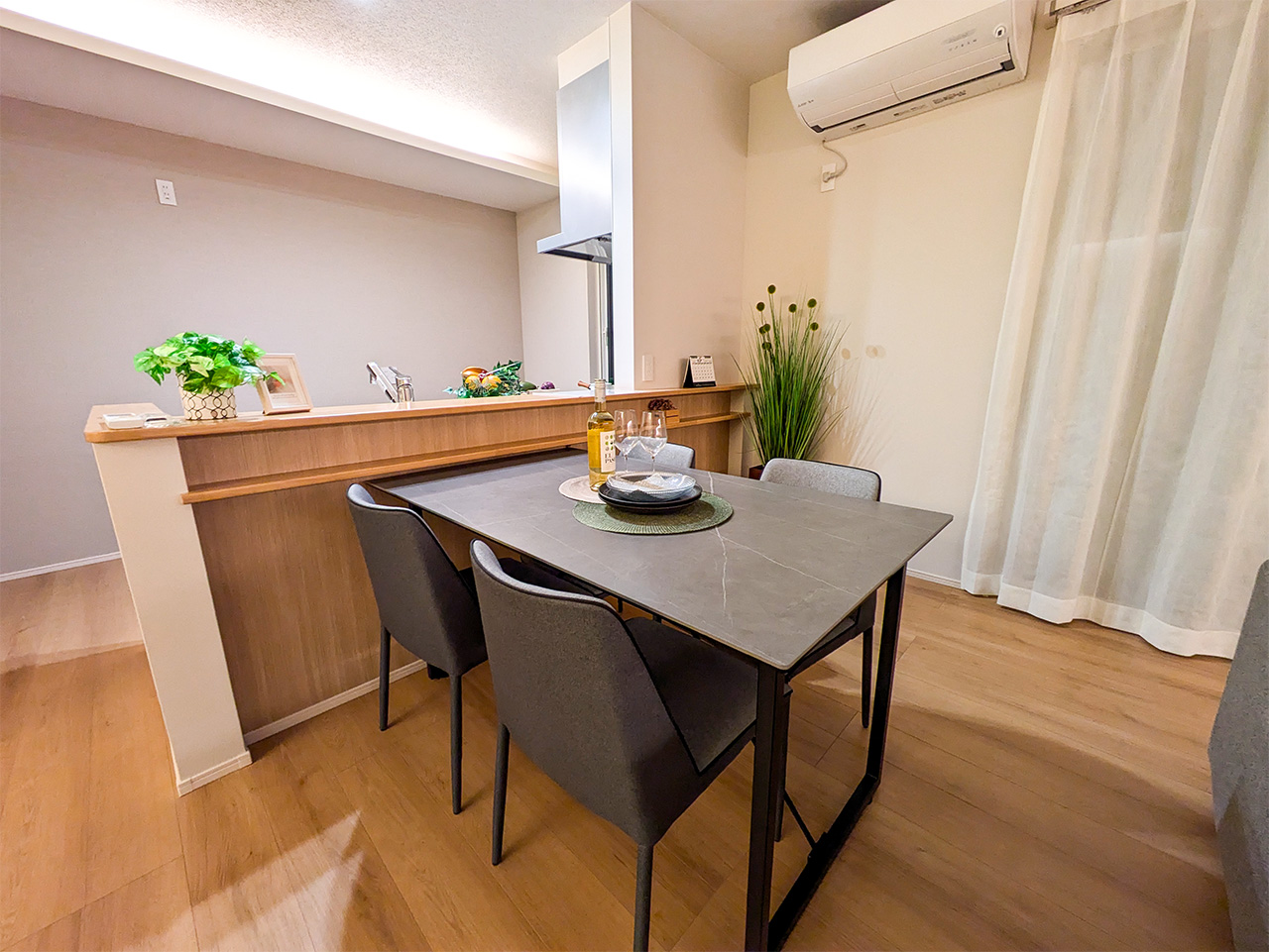 カウンターキッチンに備えた広めのカウンター。おしゃれな椅子を置くだけでおうちに居ながらCafeスペースに。平日の忙しい朝食の時間もステキに過ごせそうな空間です。