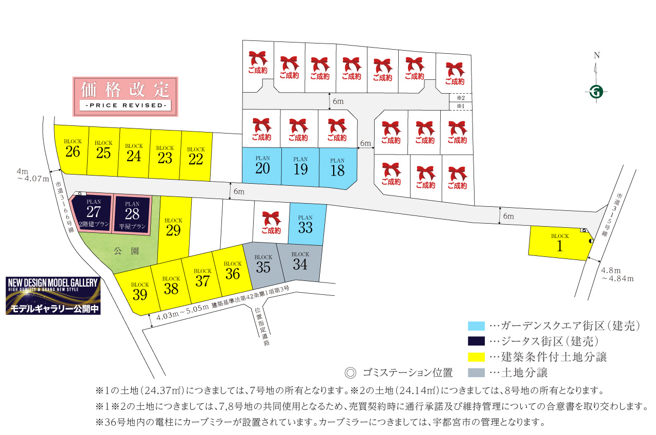 | 備考2 | ※各号地の上空を電線が通過します。 ※掲載の図面は計画段階の図面を基に描き起こしたもので、実際とは異なる場合がございます。また、施工上の理由及び改良のため変更することがございます。 ※36号地の電柱にカーブミラーが設置されています。カーブミラーにつきましては、宇都宮市の管理となります。 |