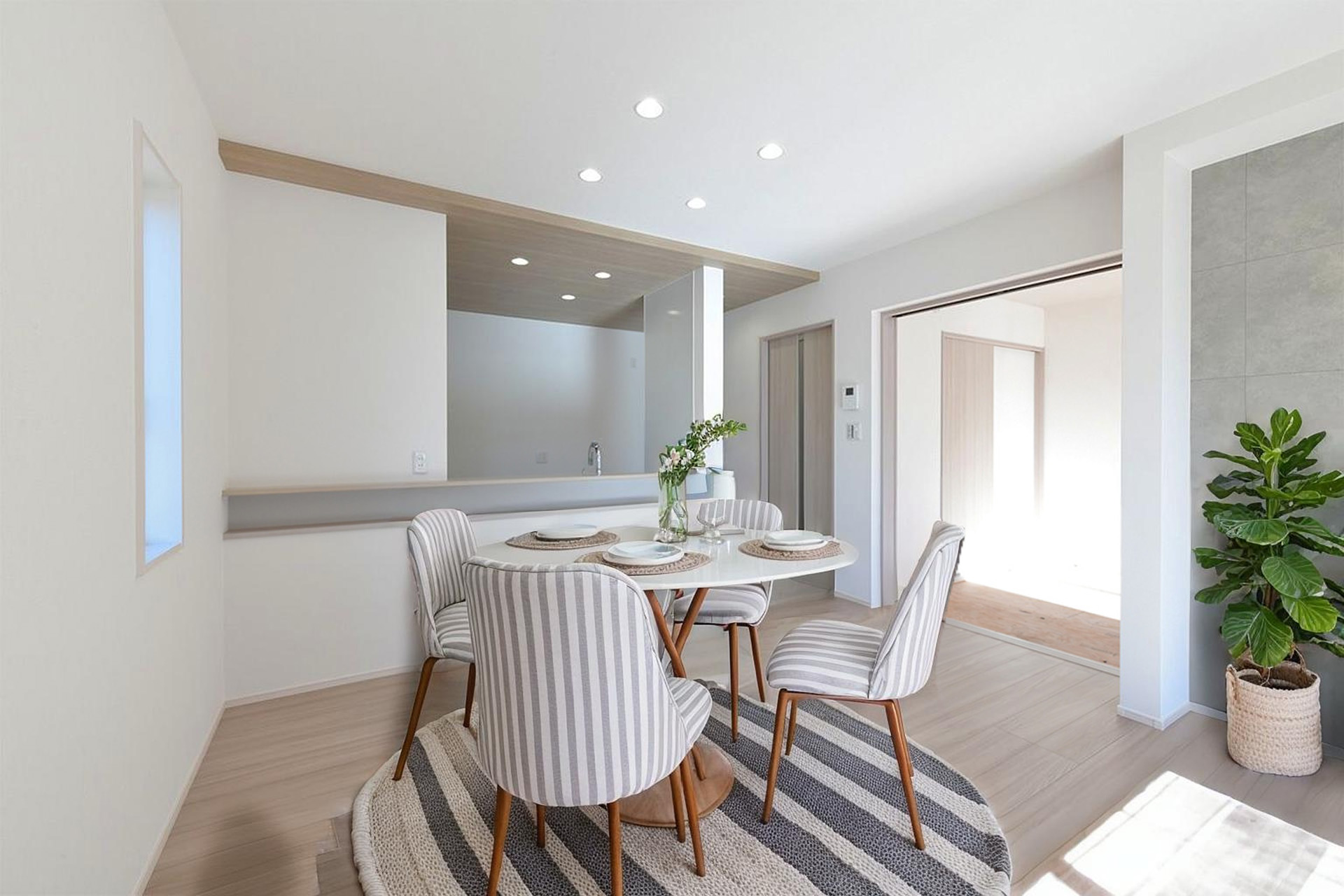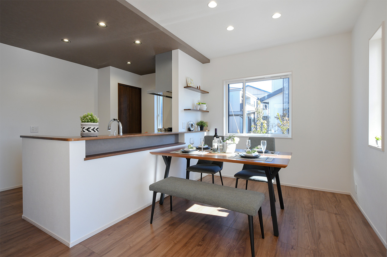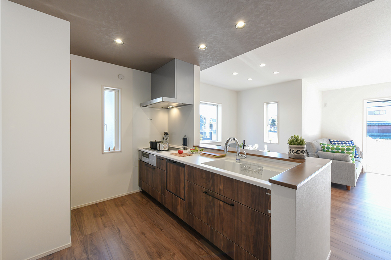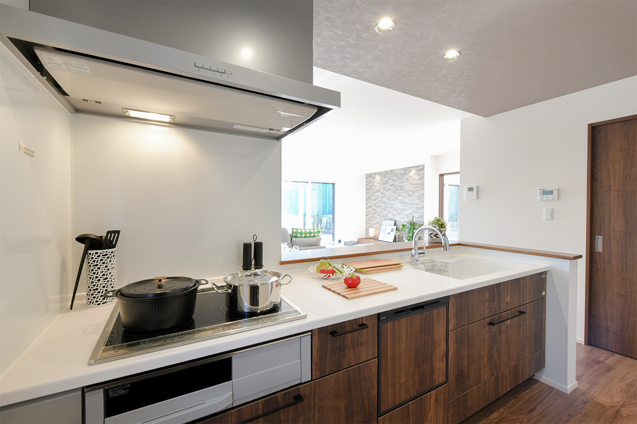 LDK空間の広さをより実感できるオープンキッチン。開放的で目線を遮るものがなくコミュニケーションが取りやすいため、料理をしながらの会話も弾み、お手伝いにも気軽に参加できます。