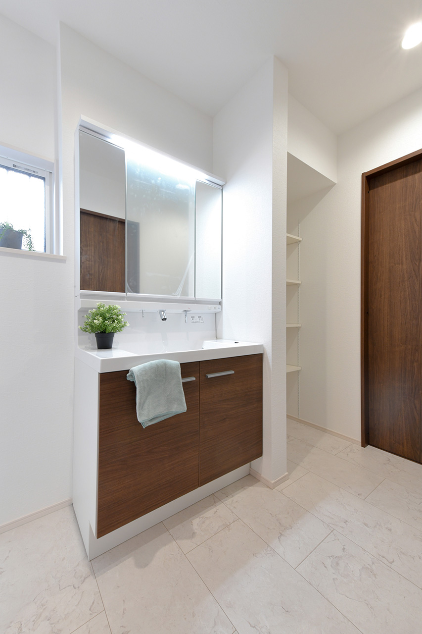 キッチンから洗面室・浴室までを最短距離で結んだ水回り動線設計。家事の移動距離を短縮するとともに、動線上には収納スペースなどをレイアウトし機能性も高めました。スマートな動線設計と時短設備が子育てにがんばるご家族をサポートします。
