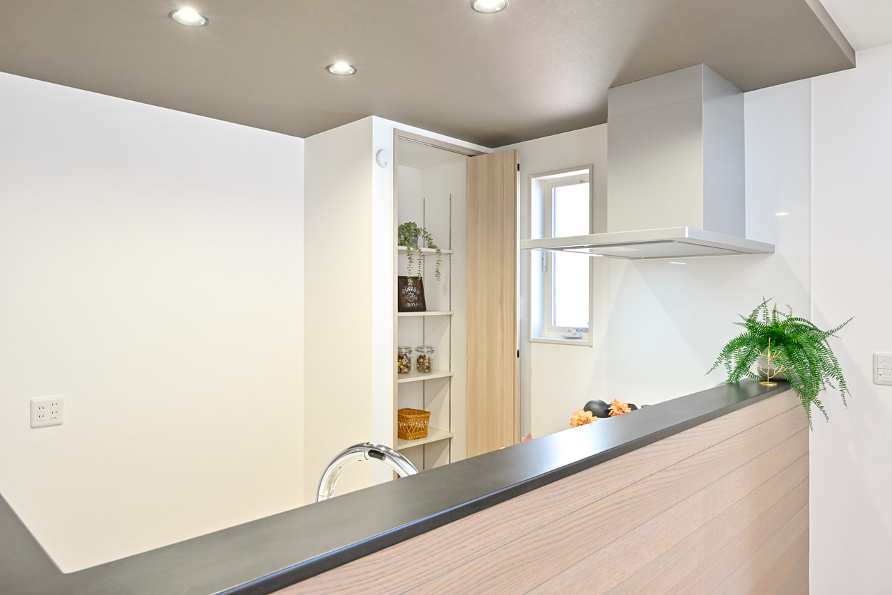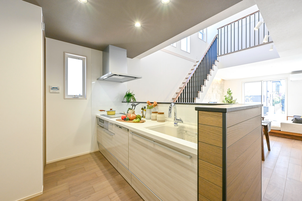 家族でのコミュニケーションがとれる対面型システムキッチンです。横一列にシンクとコンロをまとめたシンプルな形です。動きやすさとスタイリッシュなデザインが魅力です。