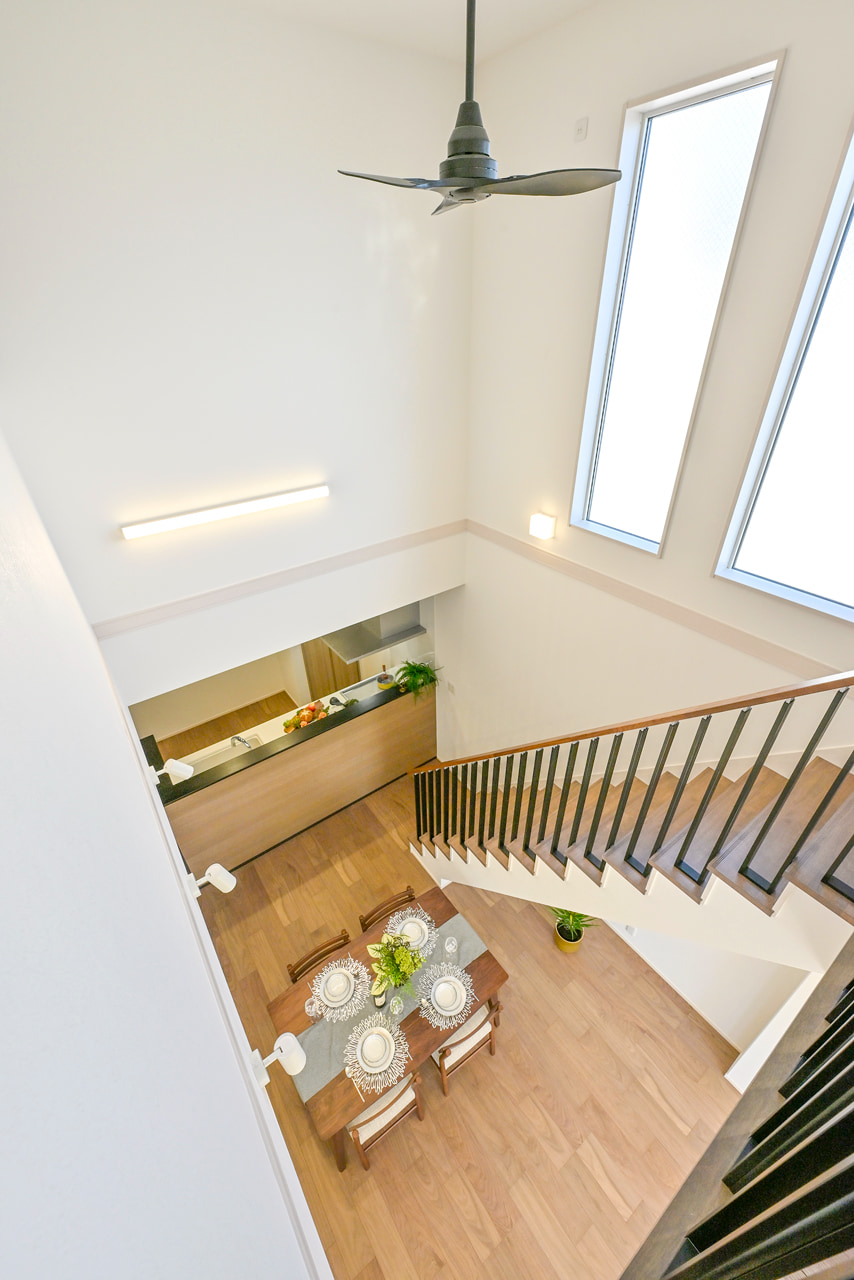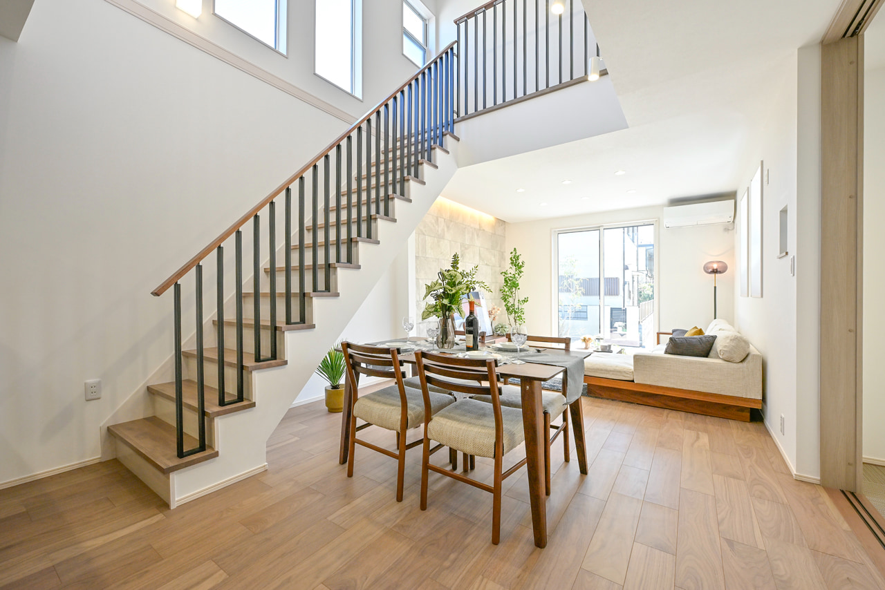 ご家族の団らんや寛ぎの中心となるリビング空間をさらに際立たせる吹抜天井プラン。2階天井まで続くその圧倒的な存在感と広がりが訪れた方を驚きを持ってお迎えします。大切にしたいご家族やゲストをもてなす上質な空間です。