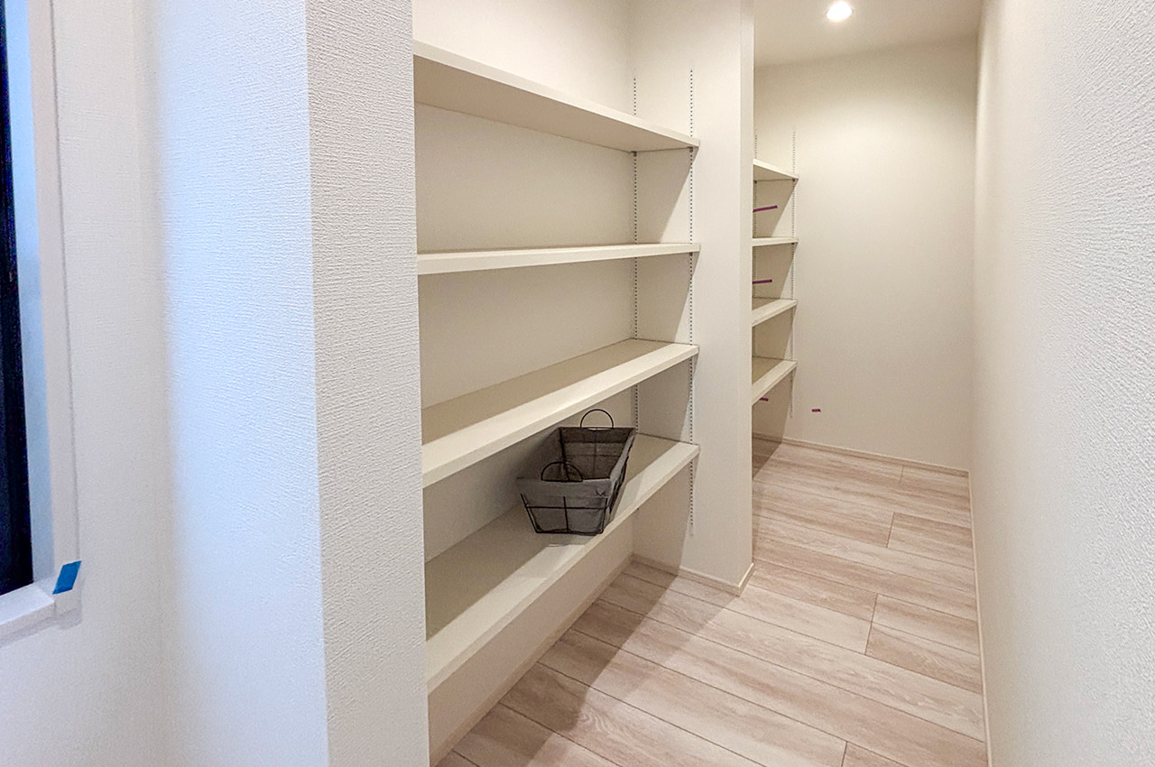 システムキッチンのすぐそばに配置したパントリー。ストック食品や調味料やお酒のほか、非常食や水のペットボトルなどの防災用品も収納できます。キッチンからすぐ手が届く場所にあるから、整理整頓もテキパキできて、キッチン空間をスッキリ保てます。