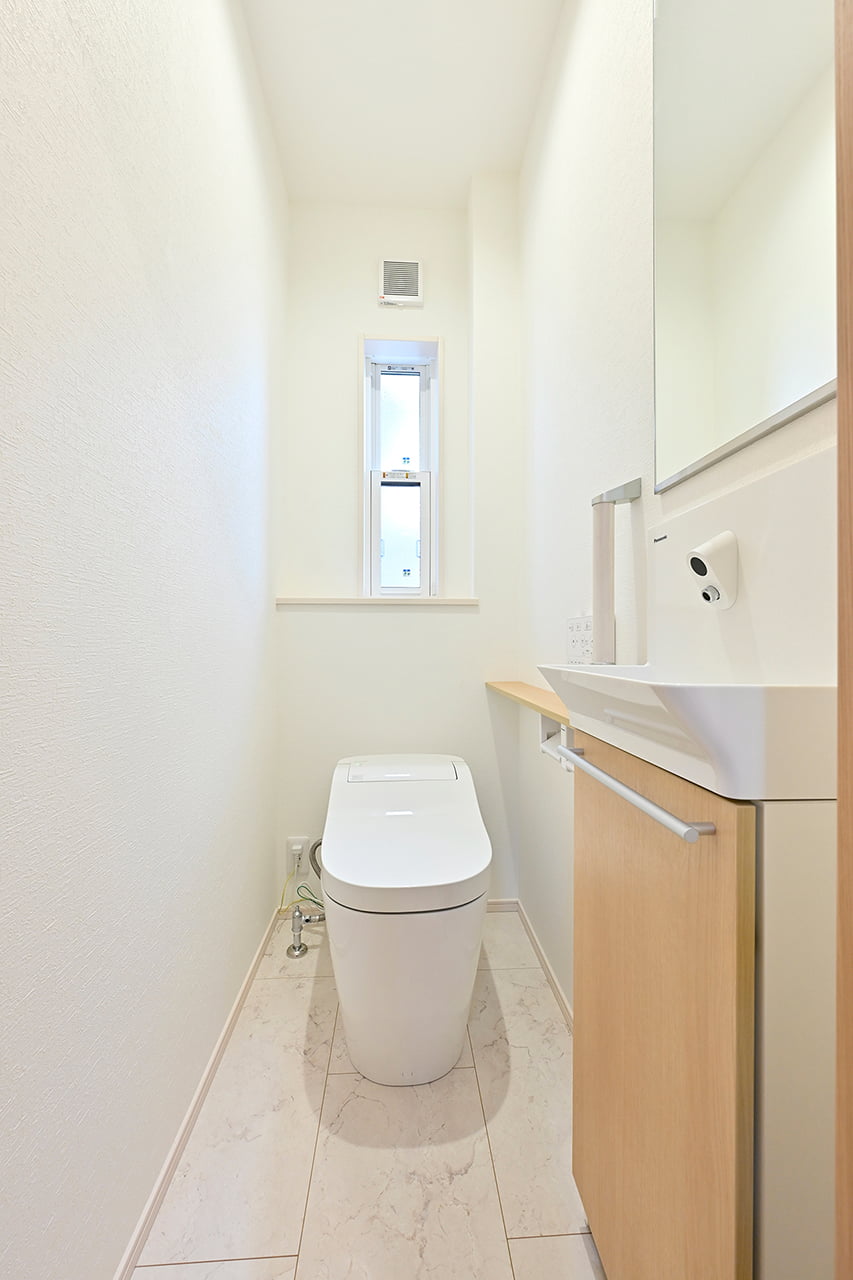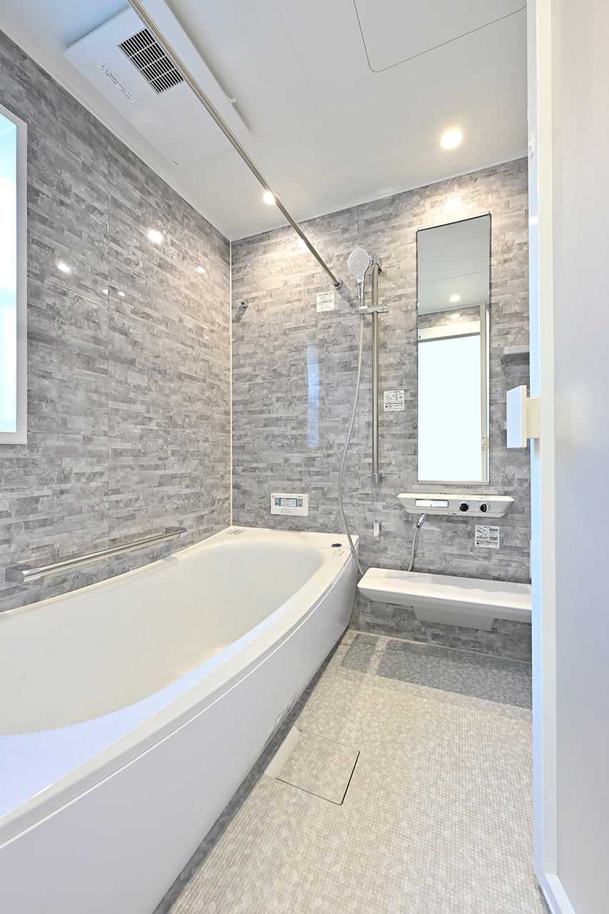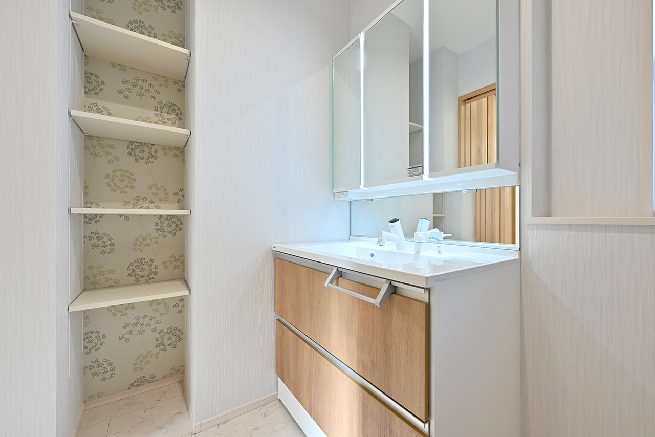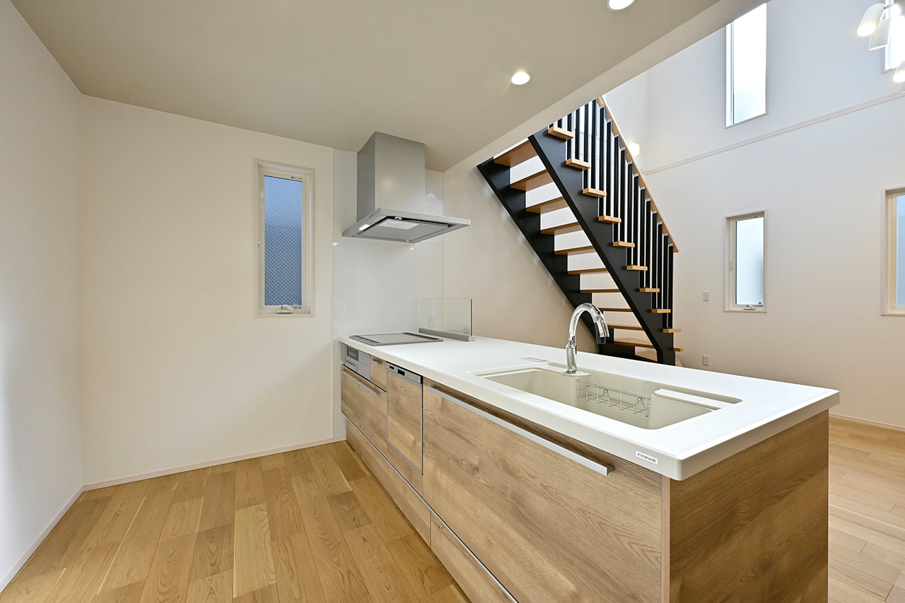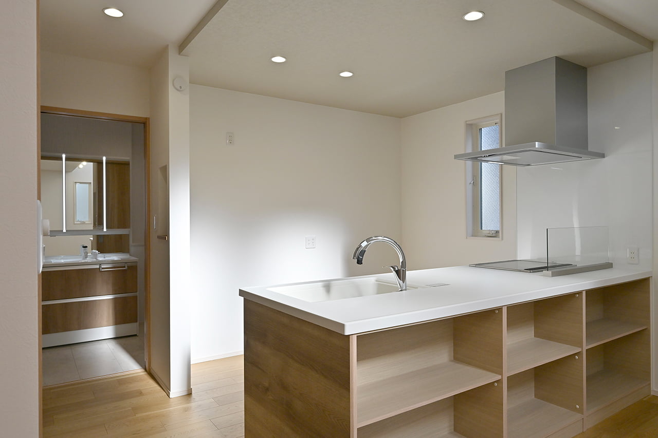 キッチンから洗面室・浴室までを最短距離で結んだ水回り動線設計。家事の移動距離を短縮するとともに、動線上には収納スペースなどをレイアウトし機能性も高めました。スマートな動線設計と時短設備が子育てにがんばるご家族をサポートします。
