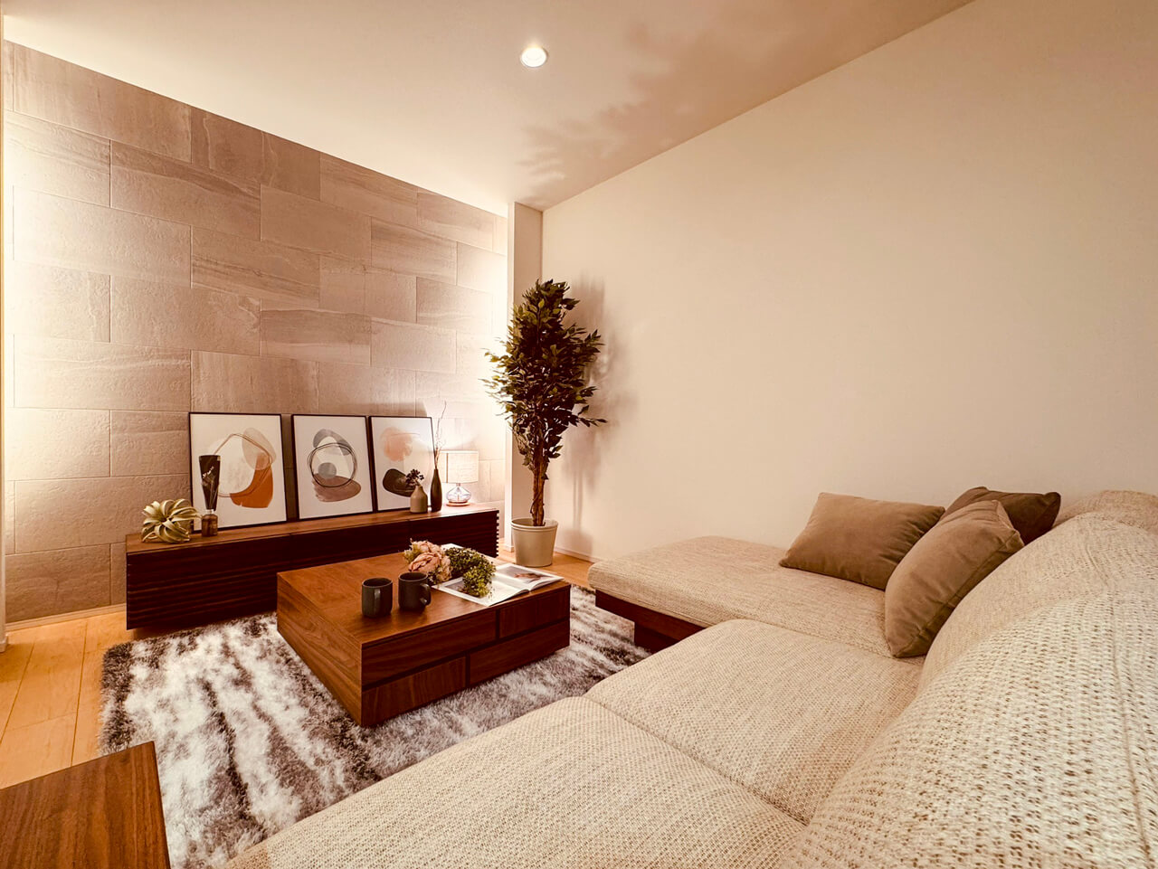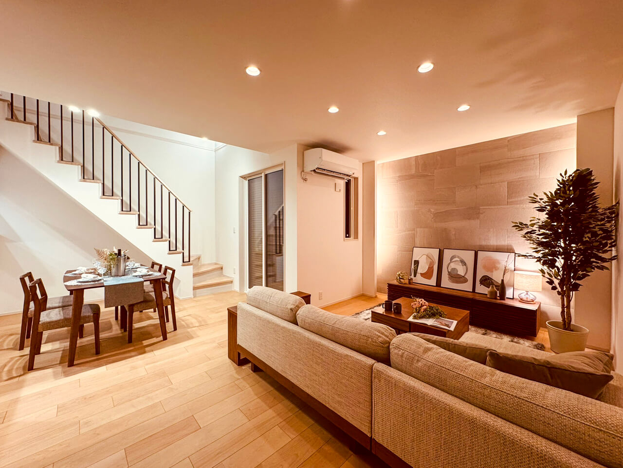 ご家族の団らんや寛ぎの中心となるリビング空間をさらに際立たせる吹抜け天井プラン。2階天井まで続くその圧倒的な存在感と広がりが訪れた方を驚きを持ってお迎えします。大切にしたいご家族やゲストをもてなす上質な空間です。