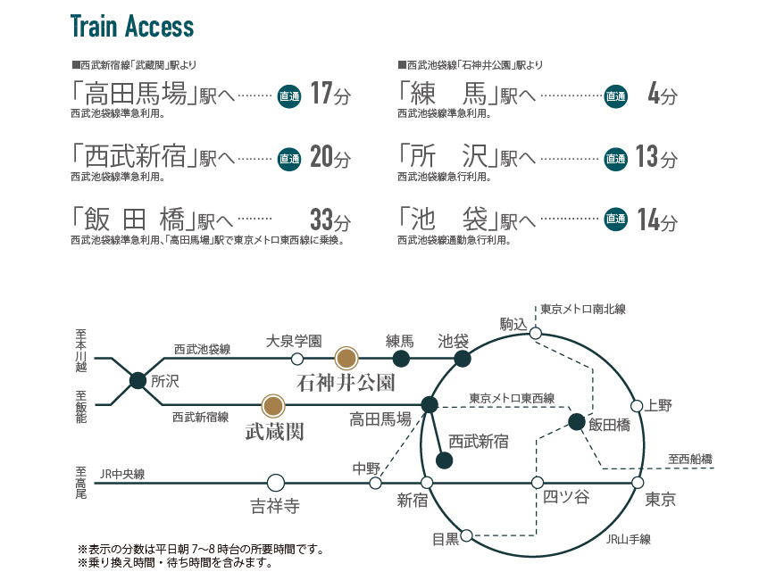 西武池袋線・新宿線の2路線利用により、都心や副都心へ軽快につながる利便性を実現。