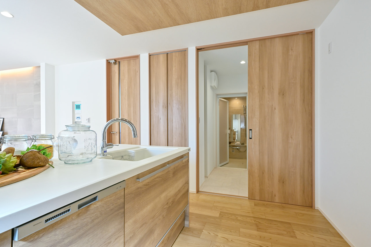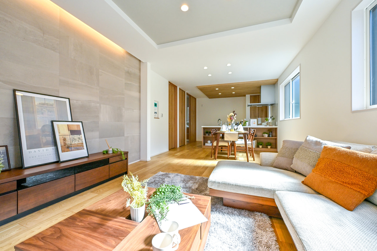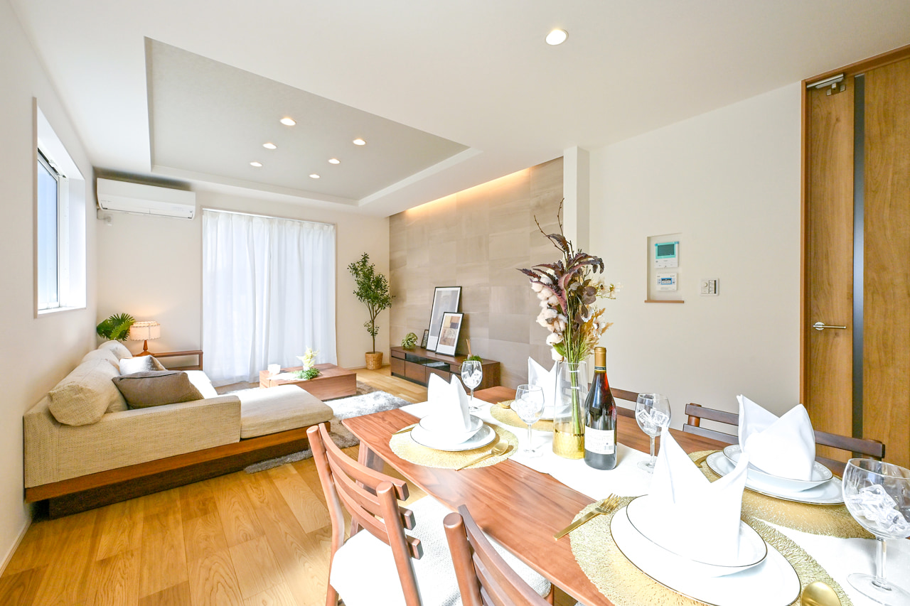 リビングやキッチンの天井に設えた間接照明。やわらかで幻想的な光の演出が、空間を落ち着いた雰囲気に包んでくれます。ご家族の特別な日のサプライズや照明を活かしたインテリアコーディネートなど暮らしに楽しさをプラス。居心地を高め、深める空間プランニングです。