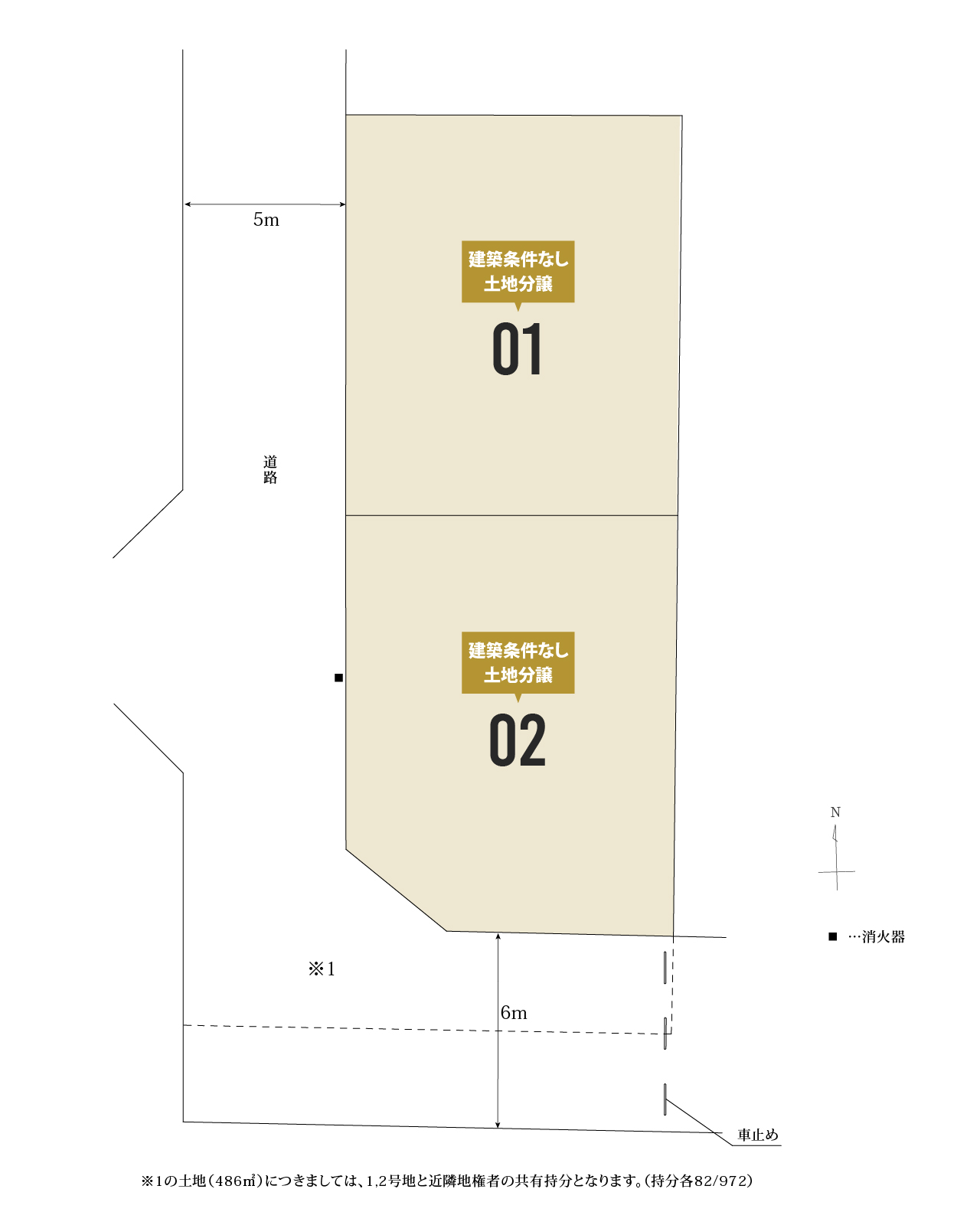 | 私道負担 | あり 販売区画図※1/486㎡持分各82/972(1・2号地、近隣地権者) |
